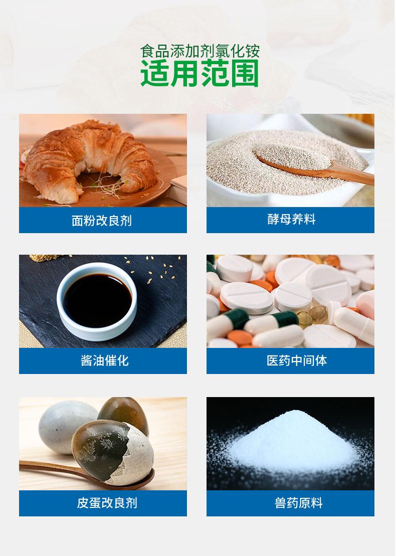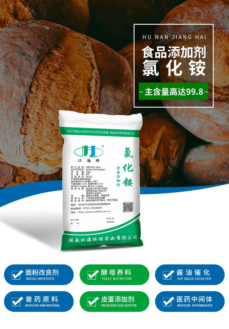 食品級氯化銨是江海公司潛心研究,在多年提純精制的經驗基礎上,通過特殊的結晶工藝精制而成,具有純度高、晶形規整、重金屬離子極低的特點,被廣泛的應用在酵母養料、面團改性、醬油催化、皮蛋上色、咸甘草糖制作等領域。同時近期發現在高品質獸藥中食品級氯化銨同樣能起到很好的作用。