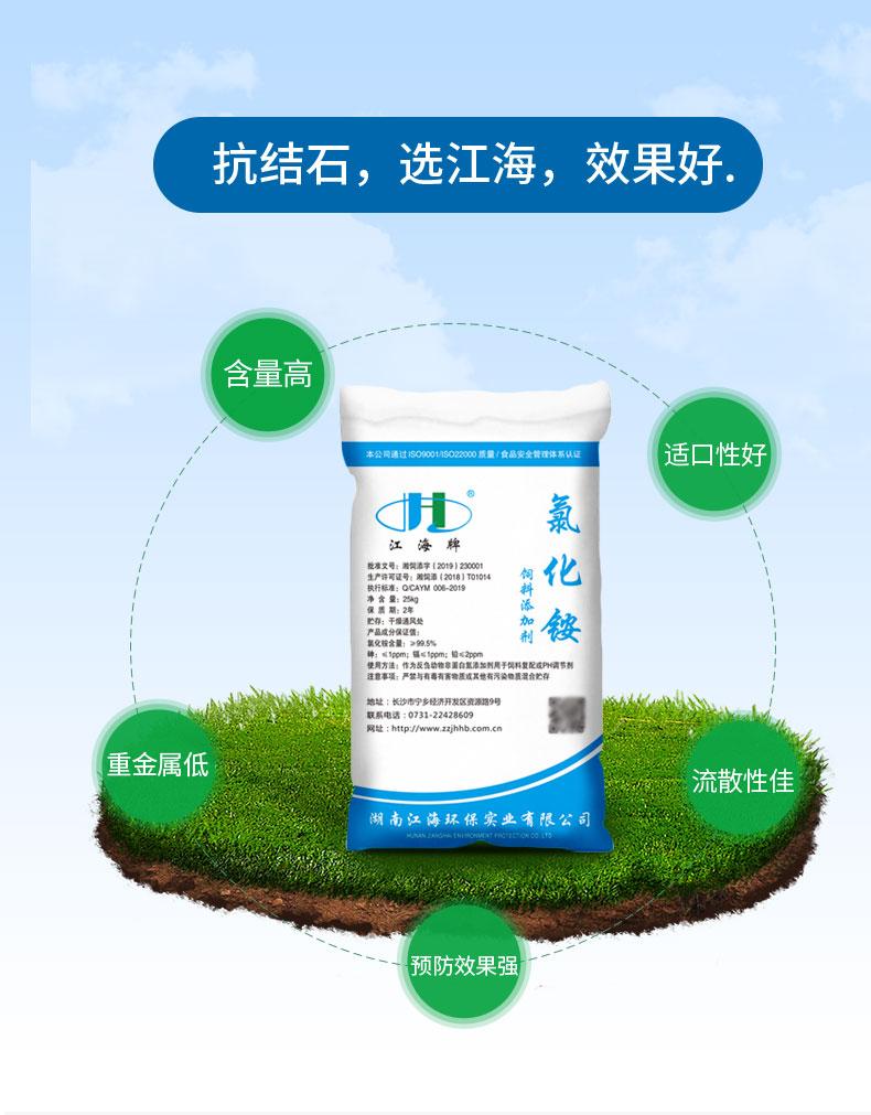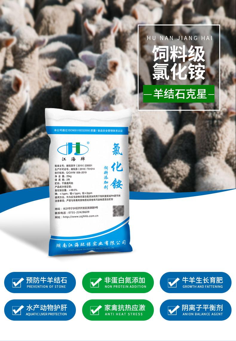 湖南江海環(huán)保實(shí)業(yè)公司生產(chǎn)的飼料級氯化銨是以農(nóng)用或工業(yè)氯化銨為原料經(jīng)過去雜、提純等工藝精制而成。產(chǎn)品純度高,重金屬離子含量低等特點(diǎn)。能作為非蛋白劑補(bǔ)充反芻動物蛋白質(zhì)營養(yǎng),也被廣泛作為反芻動物抗結(jié)石劑,奶牛產(chǎn)前的陰離子平衡劑,家禽抗熱應(yīng)激藥物,應(yīng)用前景十分廣泛。